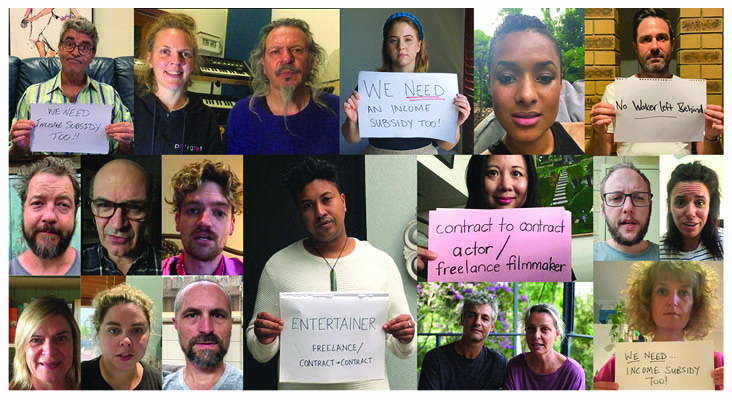 Screenshots of MEAA members who took part in an online day of action on April 2 to lobby for support for the arts sector and the extension of the JobKeeper program.